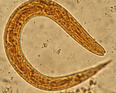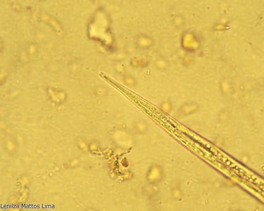 Vermes adultos: Fêmeas maiores que os machos, medindo cerca de 1cm de comprimento. Machos medem cerca de 4 mm com extremidade posterior enrolada ventralmente.