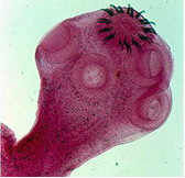 Ovos: os ovos de Taenia solium e Taenia saginata são semelhantes. Apresentam forma esférica com cerca de 35m de diâmetro, com espesso embrióforo de aspecto radiado e no interior, o embrião hexacanto já infectante. Geralmente, as proglotes liberam seus ovos ao chegar ao ambiente externo, mas podem ser comprimidas pelo esfíncter anal e liberar os ovos neste local.