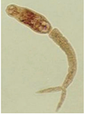 Cercária: As cercárias apresentam contorno piriforme, com extremidade anterior constituído de glândulas de penetração. A cauda é longa e delgada, finalizada pela fúrcula, que contém movimentação vibratória, permitindo o movimento das cercarias na água, com isso são capazes de penetrar a pele do hospedeiro vertebrado.